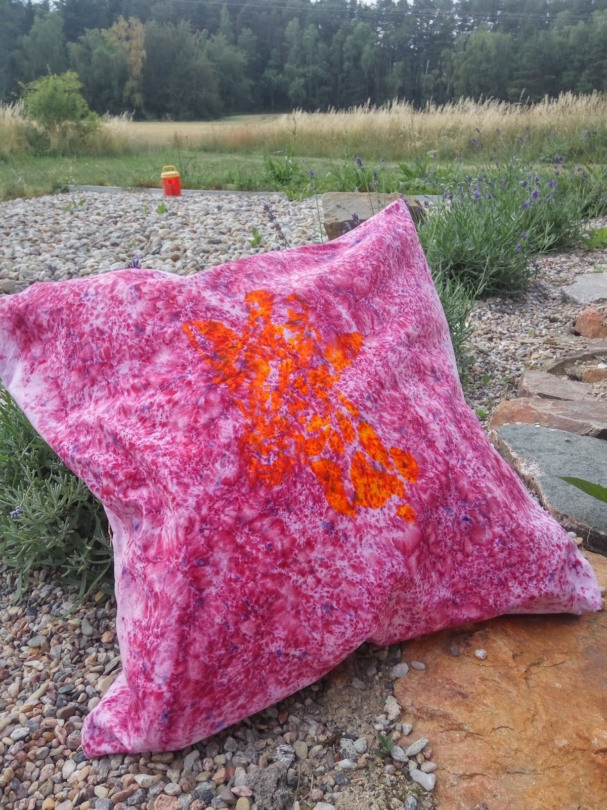 Letos jsem vymyslela polštářky.... Polštářky se koupí,povlaky se ušijí z prostěradla, pěkně se nabatikujou a dobarví barvami na textil.